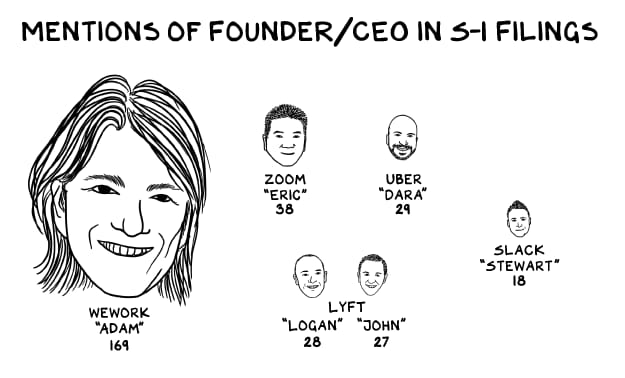 Amongst Neumann’s many mad antics was the insistence on a company mission statement to Elevate the World’s Consciousness - did I mention they rent desk space for a living? An IPO filing that mentioned himself 169 times (see the image above for how that benchmarks). And trademarking the word ‘we’ and then charging his own company millions of dollars for the rights to use it.